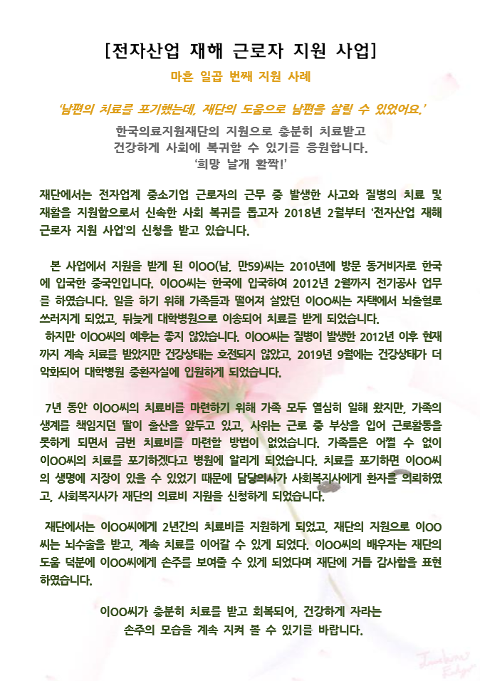 '남편의 치료를 포기했는데, 재단의 도움으로 남편을 살릴 수 있었어요.'